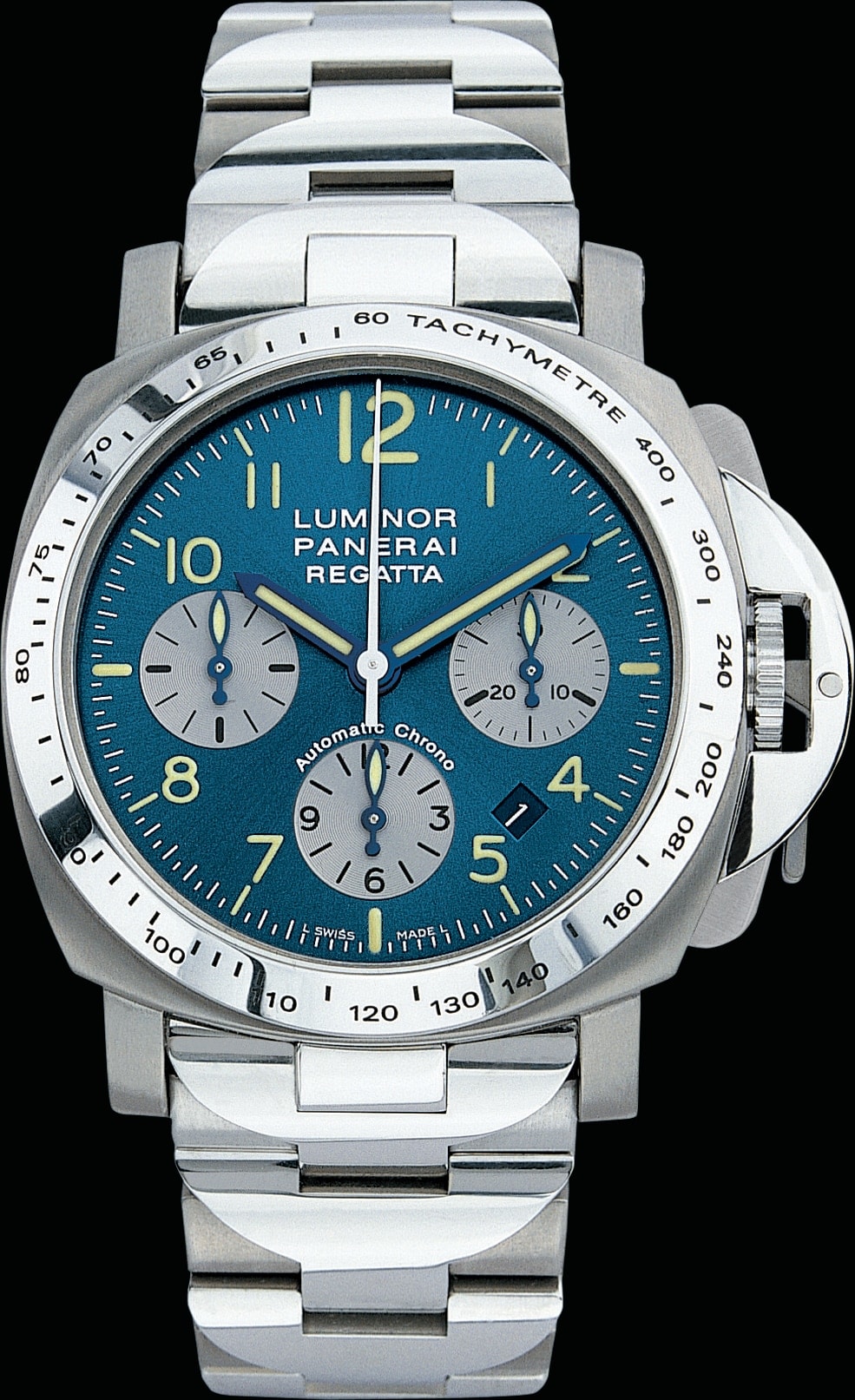 أزرق مع مؤشرات ساعات وأرقام عربية مضيئة. عدّادات الكرونوغراف باللون الفضّي