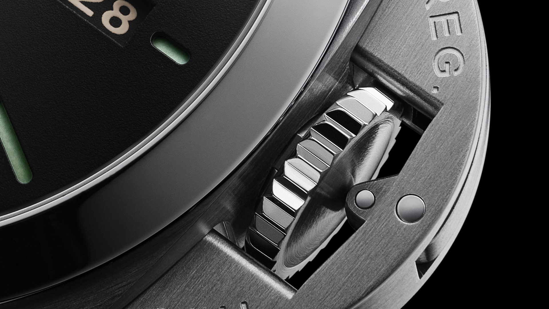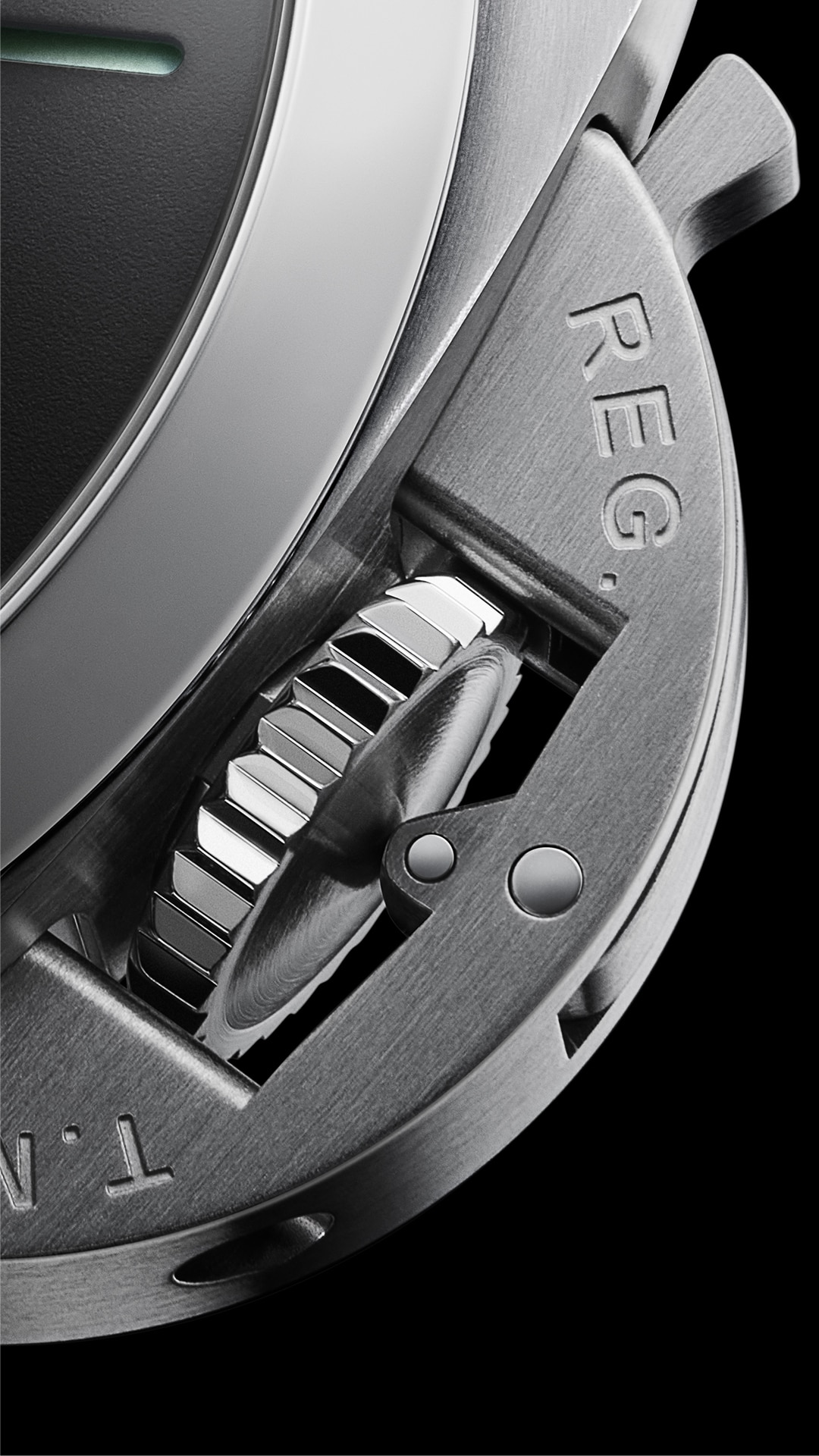 Breveté par Panerai, le dispositif protège-couronne est devenu un symbole distinctif de la Maison et porte l’inscription gravée « REG. T.M. » en tant que marque déposée.