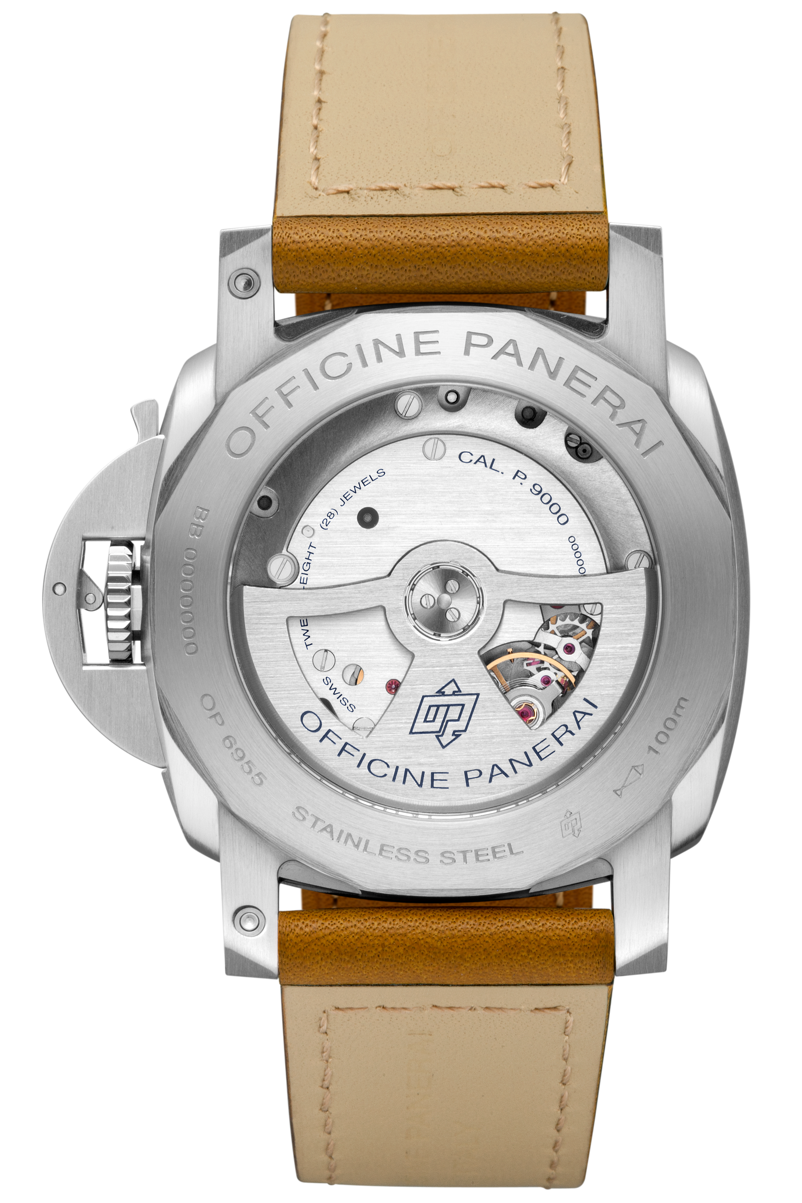 Mechanisches Automatikuhrwerk, Kaliber P.9000, vollständige Panerai Eigenfertigung, 13¾ Linien, 7,9 mm stark, 28 Steine, Glucydur®-Unruh, 28.800 Schwingungen/Stunde. Incabloc®-Stoßsicherung. 3 Tage Gangreserve, zwei Federhäuser. 197 Bauteile