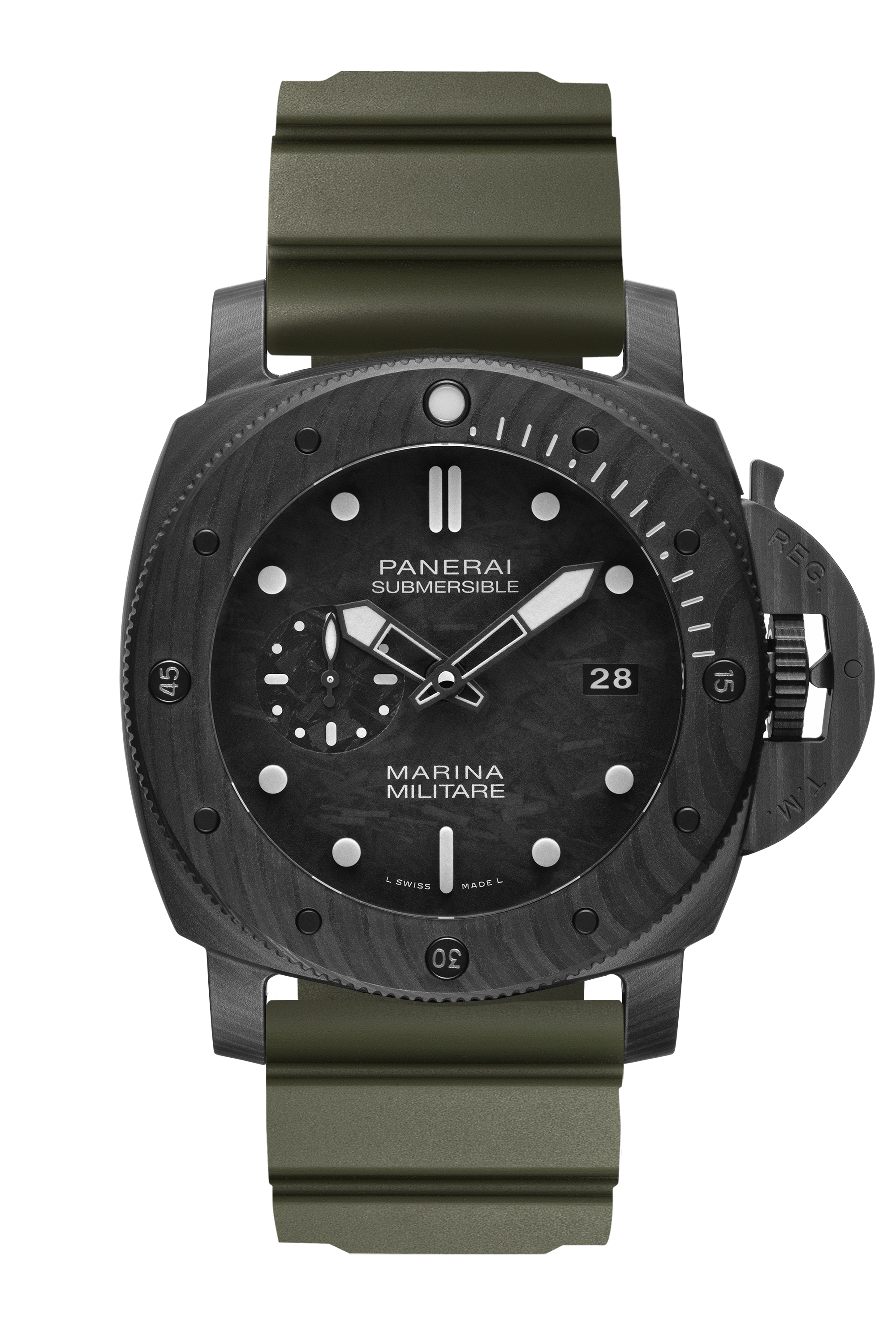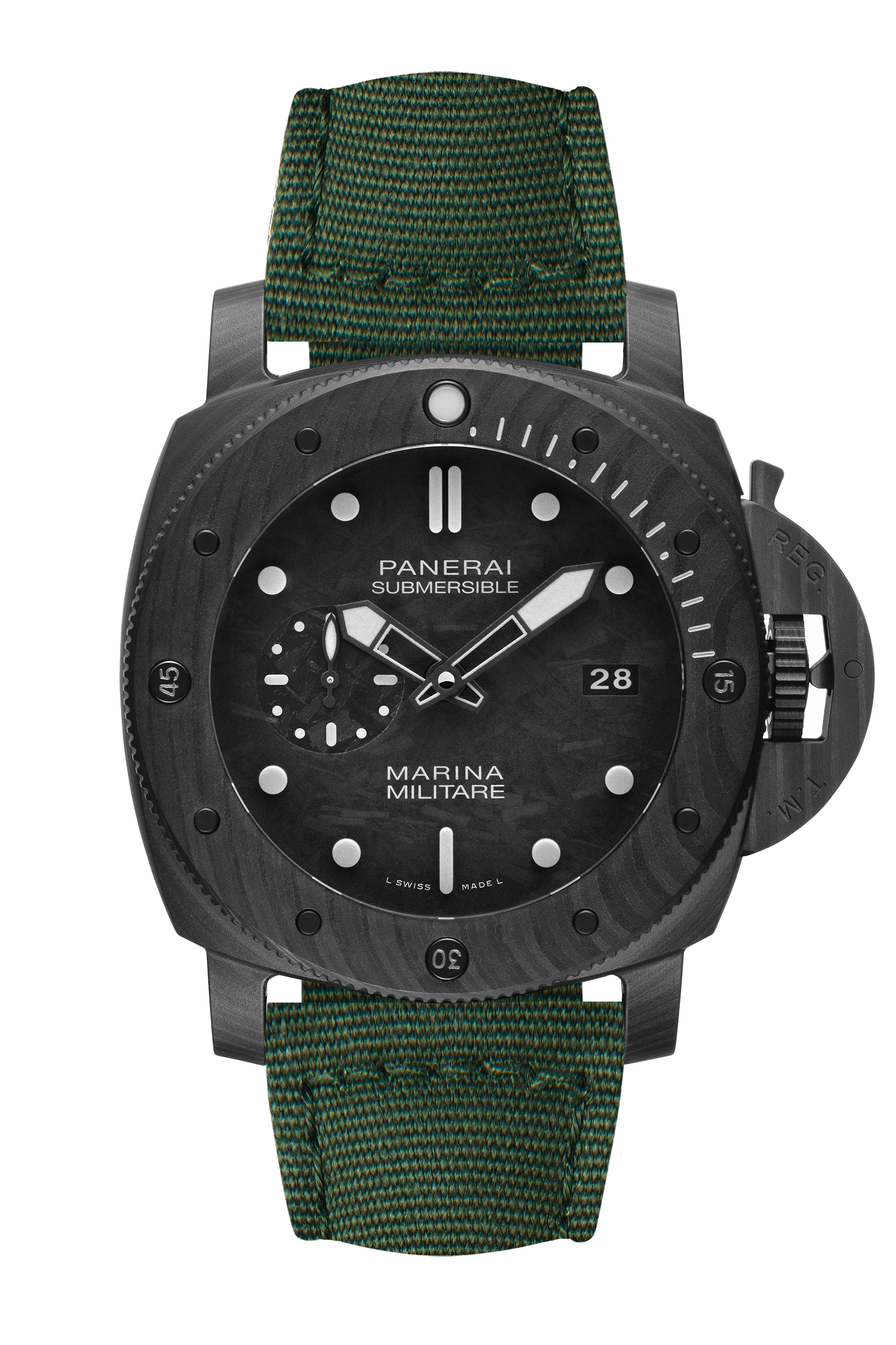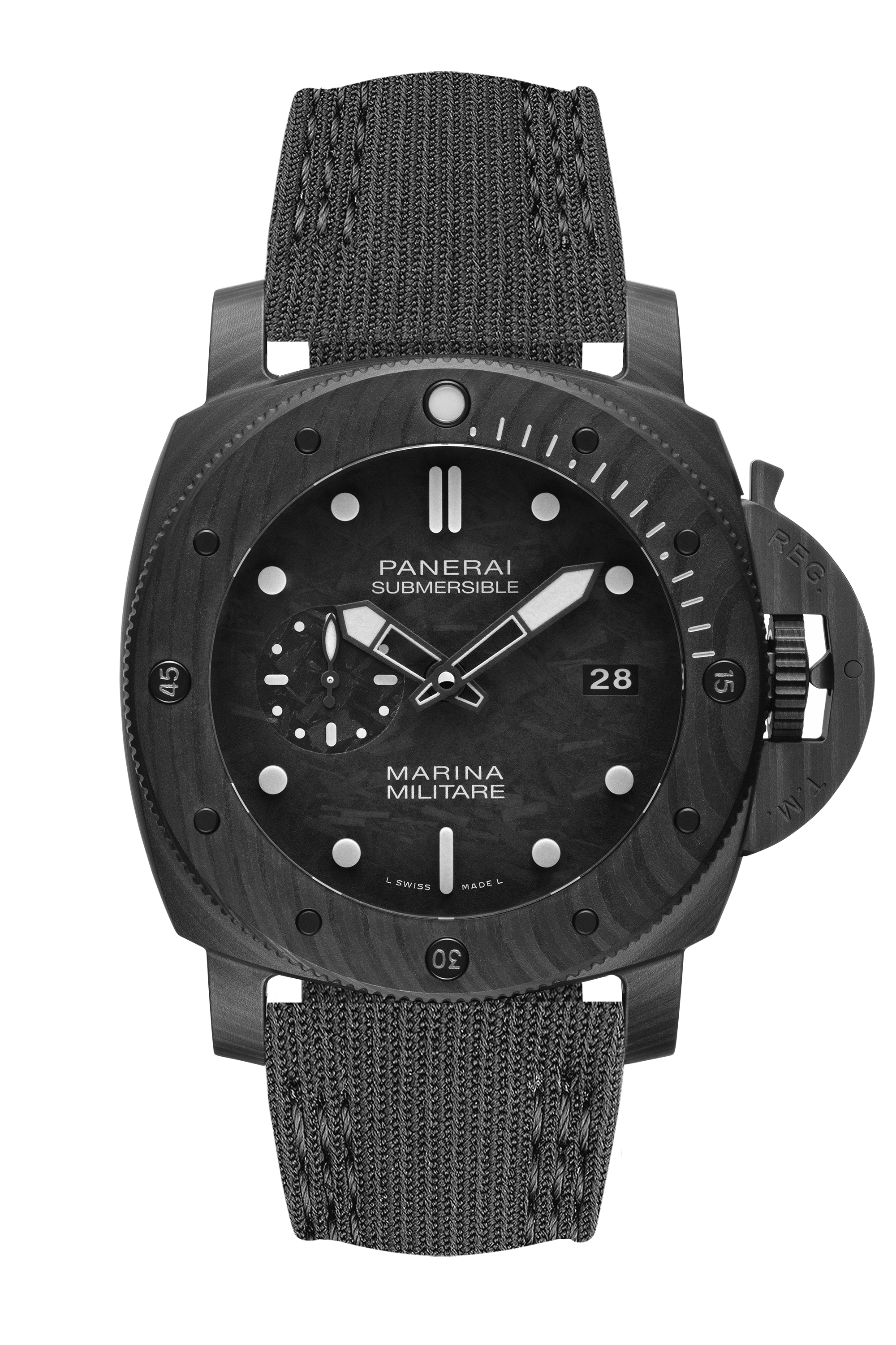 Black carbon with luminous hour markers and dots. Date at 3 o'clock and small seconds at 9 o'clock.
