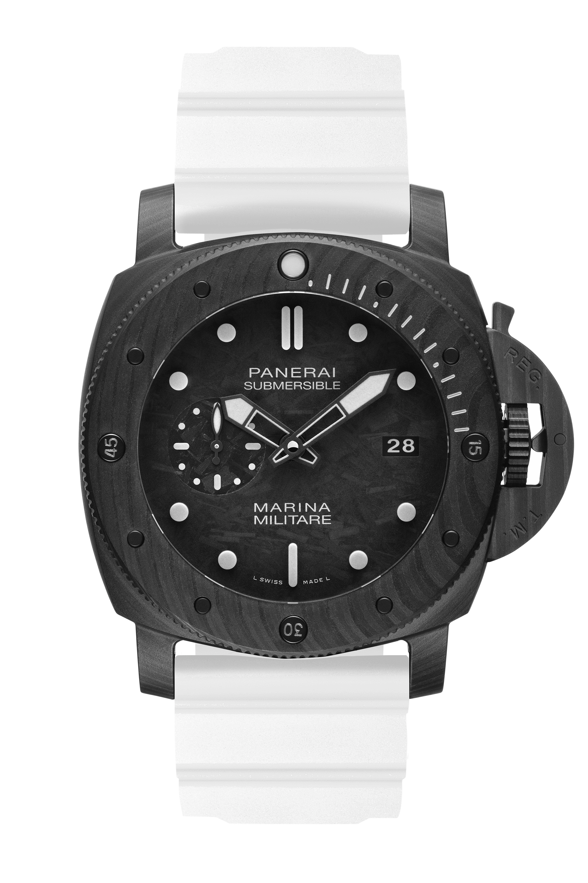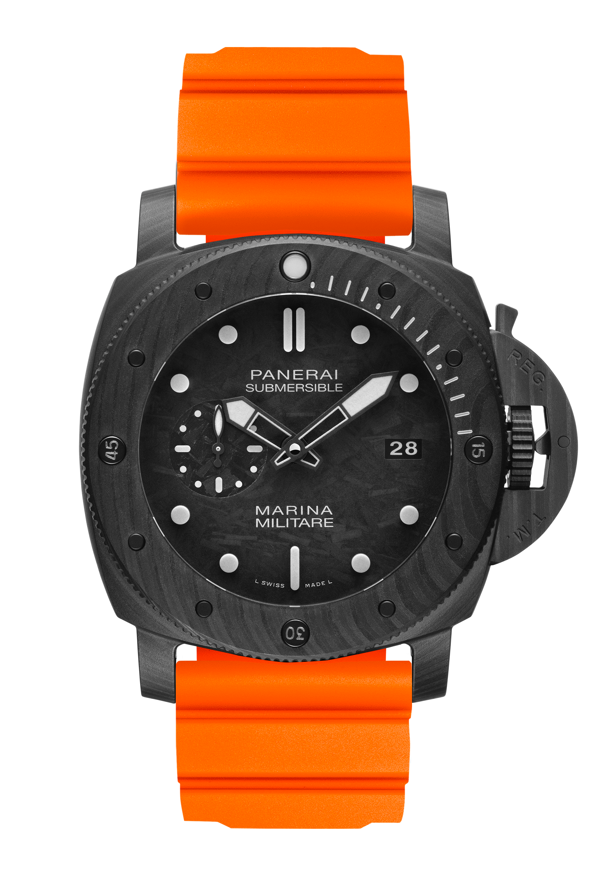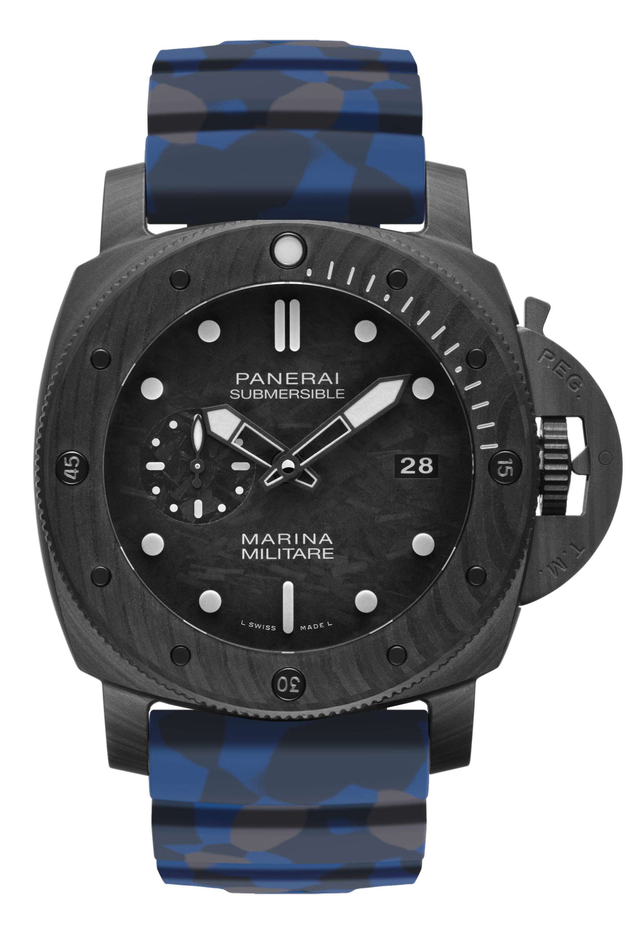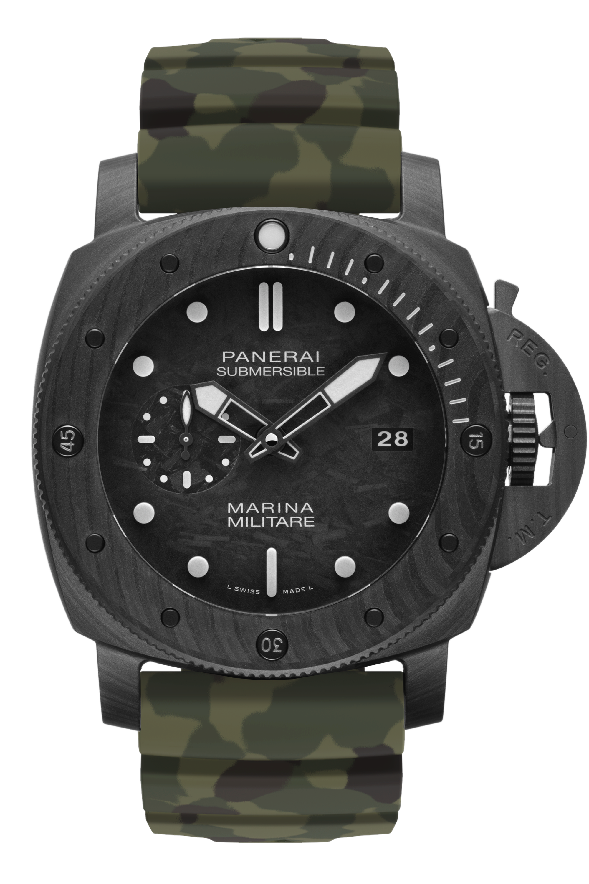 Black carbon with luminous hour markers and dots. Date at 3 o'clock and small seconds at 9 o'clock.