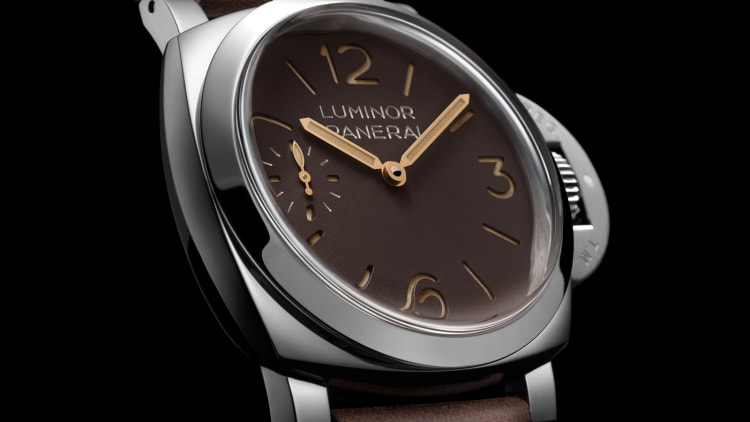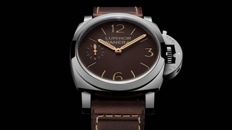 Dial: Brown tobacco with luminous Arabic numerals and hour markers. Small seconds at 9 o'clock.