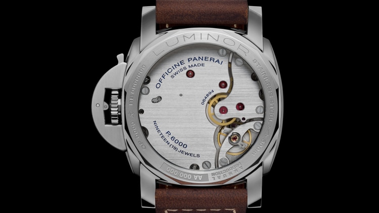 Hand-wound movements remain fundamental to Panerai’s watchmaking expertise, echoing the robust calibres that powered its early underwater instruments. The P.6000 delivers a three-day power reserve, a stable balance wheel beating at 21,600 vibrations per hour and a stop-balance wheel for precise synchronization. Visible through the open caseback, it features blue engravings and horizontally brushed plates.