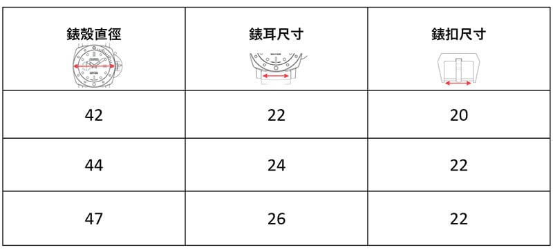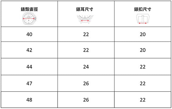 第一個尺寸(24MM)是指錶殼相連處的距離,第二個尺寸(22.0MM)則代表錶扣相連處的距離。