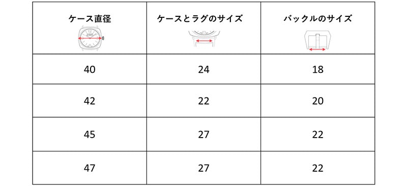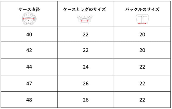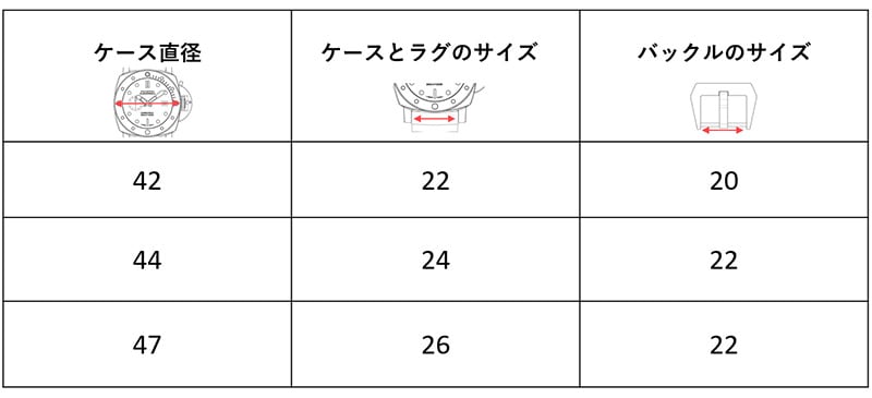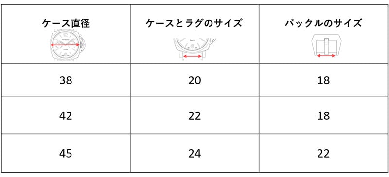 ケースサイズとバックルの幅によって、パネライのウォッチは異なるテーパー表示を特徴としています。これはウォッチに合わせてストラップを識別するために必要な情報です。