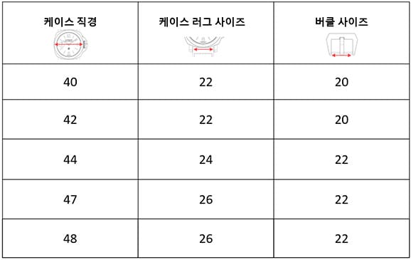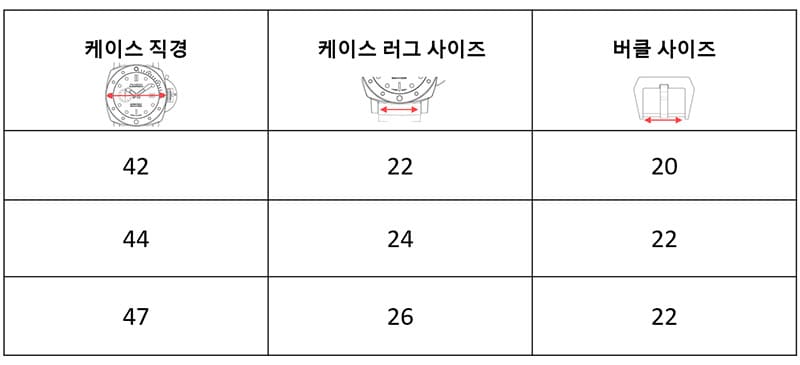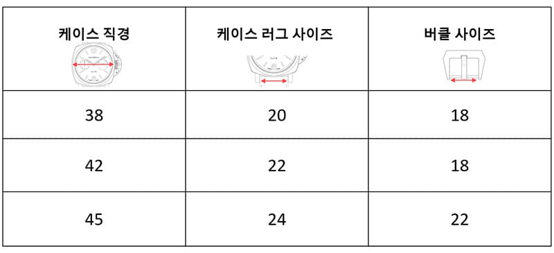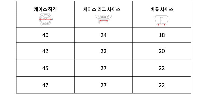 케이스 사이즈와 버클 너비에 따라 파네라이 시계는 테이퍼 표시가 달라집니다. 시계와 스트랩이 맞는지 확인하기 위해서는 이 정보가 꼭 필요합니다.