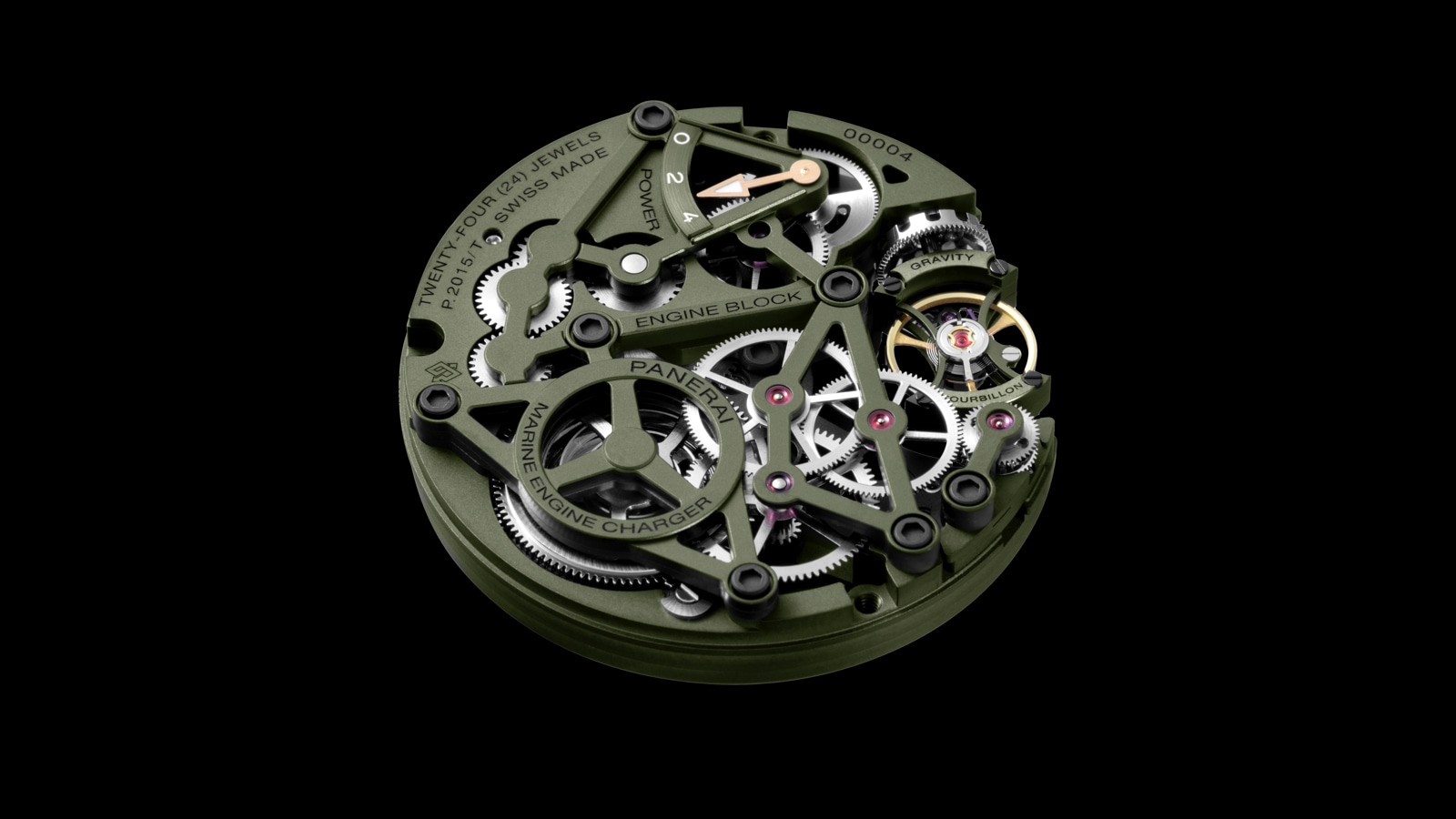 Калибр с турбийоном P.2015/T, выпущенный в 2023 году, – это новый механизм, который подойдет по размеру для запястья любой окружности. Внутри функционирует инновационный запатентованный в 2008 году турбийон Panerai, каретка которого вращается вокруг оси, перпендикулярной оси балансового колеса, и совершает полный оборот за тридцать секунд. Эта специальная система позволяет эффективно компенсировать погрешности, вызванные воздействием гравитации, что благоприятно сказывается на точности хода. Часы с запасом хода до четырех дней показывают время второго часового пояса (функция GMT) с помощью центральной стрелки с треугольным наконечником, а также оснащены 24-часовым счетчиком в положении «3 часа» с указателем дневного/ночного времени суток.