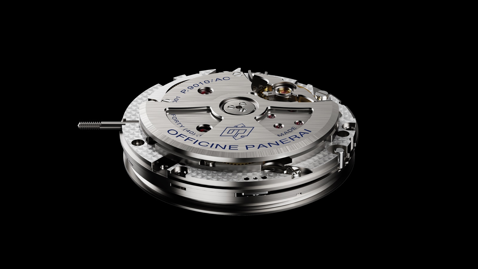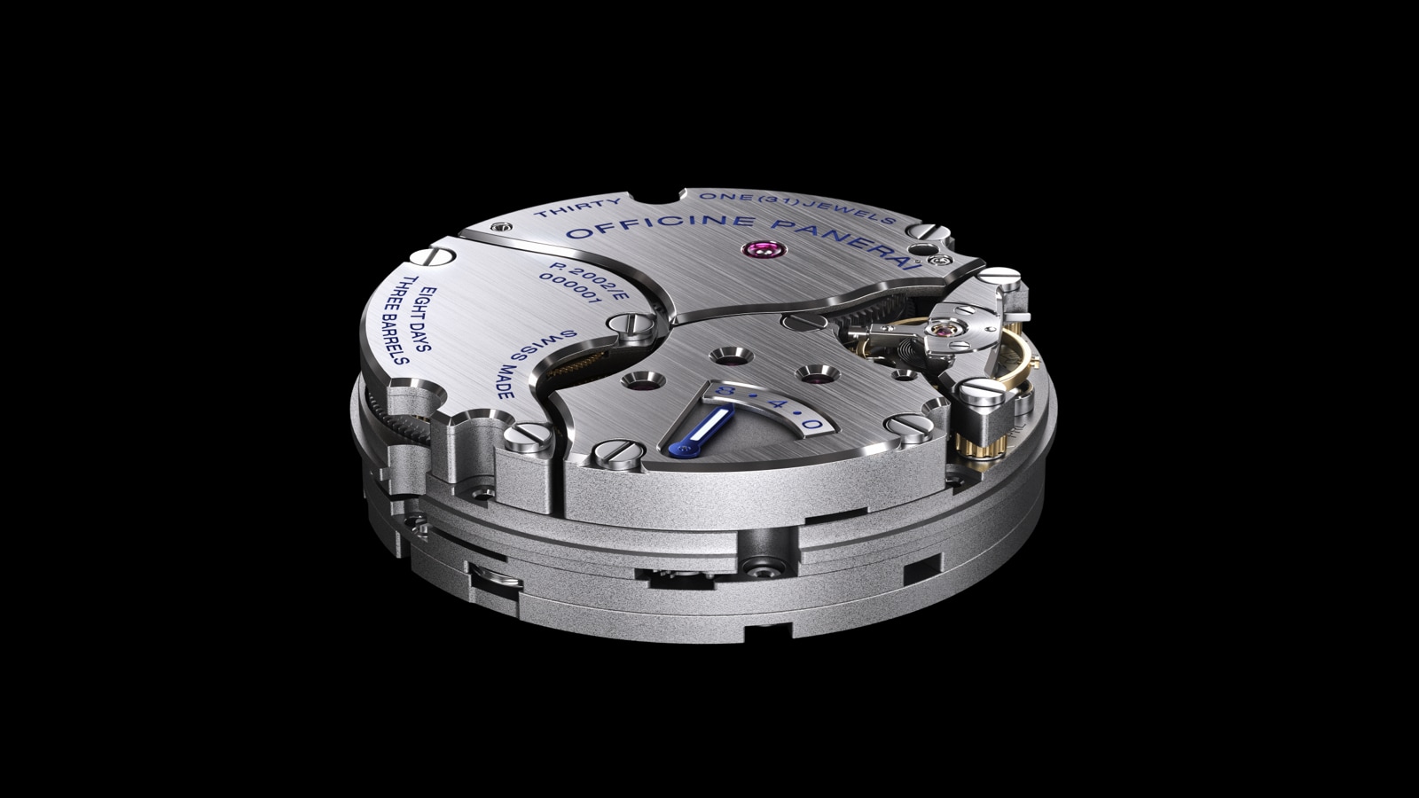 Скелетонизированный автоматический механизм – это дань уважения мастерству Panerai. Полностью скелетонизированный калибр оснащен смещенным относительно центра микроротором, открывающим взору сложный внутренний мир часов. В результате благодаря скелетонизированному дизайну можно увидеть всю сложность калибра часов. Запатентованный прозрачный поляризованный диск в положении «3 часа» показывает дату, не заслоняя расположенные под ним детали. Механизм также оснащен вращающимся в обоих направлениях микроротором, который заводит два последовательно соединенных барабана, обеспечивая трехдневный запас хода.