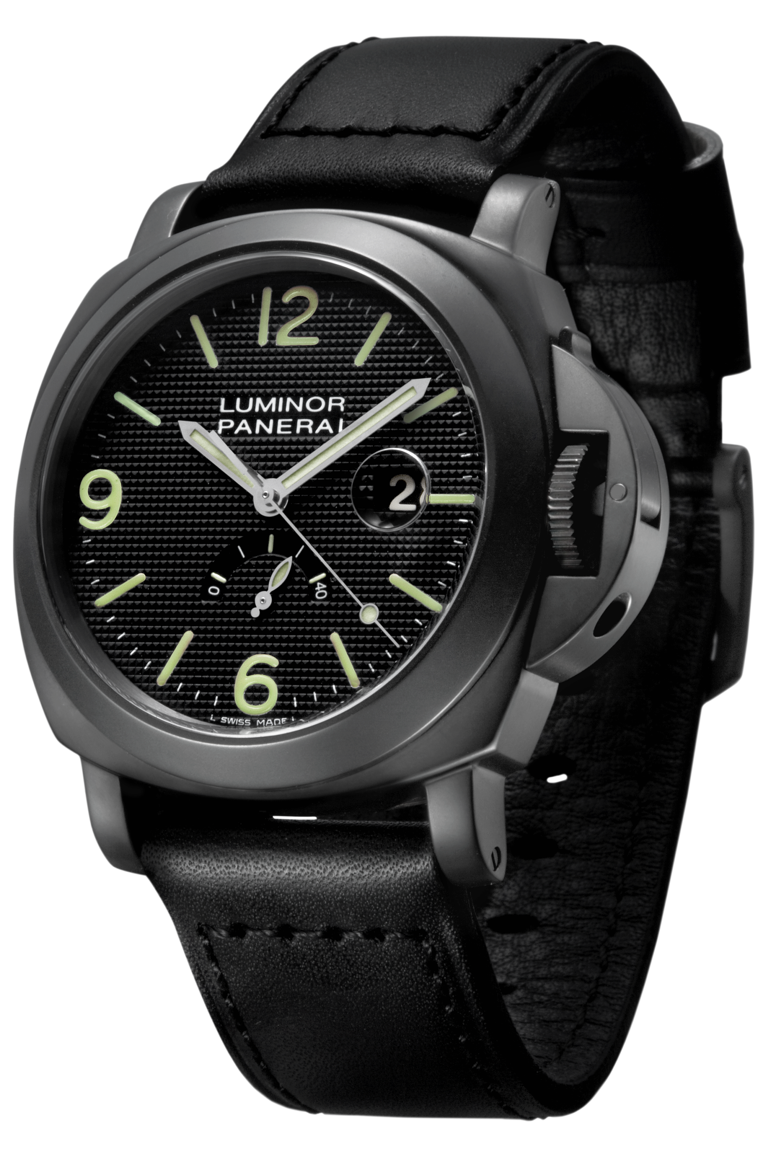 Black with Paris hobnails decoration. Luminous Arabic numerals and hour markers Date at 3 o’clock, power reserve indicator at 6 o’clock, central seconds hand