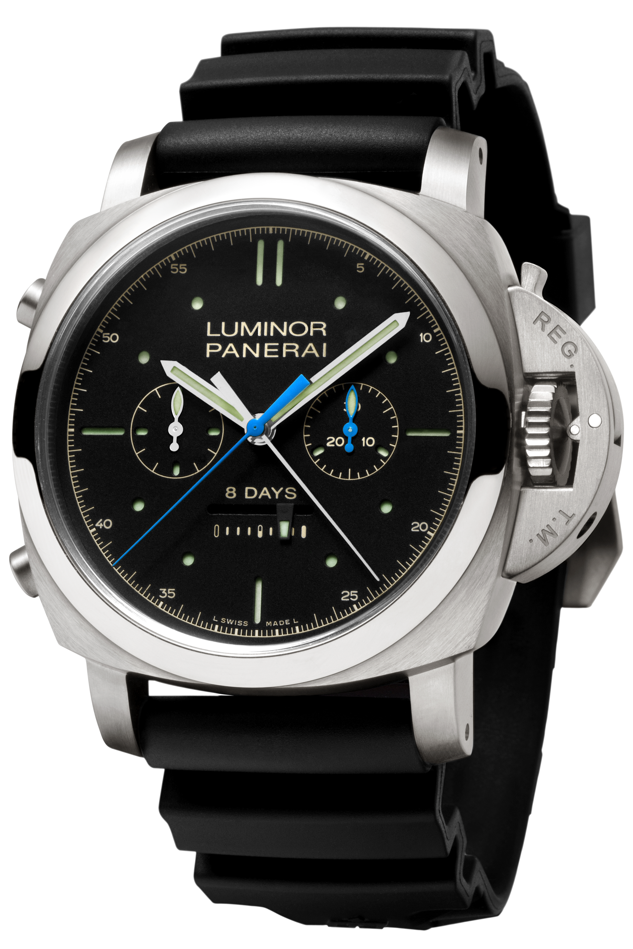 Black with luminous dots and hour markers Minute counter at 3 o’clock, seconds at 9 o’clock, linear power reserve indicator at 6 o’clock, central chronograph and split-second hands. Chronograph seconds scale on the outer edge