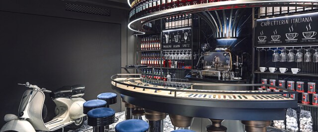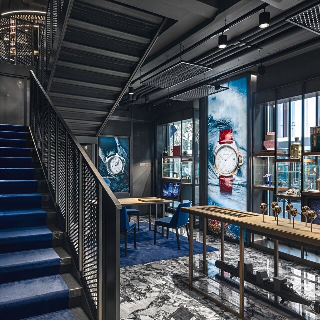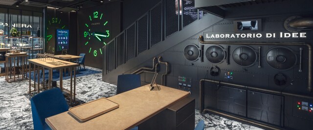 Panerai is the product of distinct traditions rooted in two countries: the sophistication of Swiss watchmaking artistry and an illustrious history of design inheritance from Italy. Situated at 21 Rue du Rhône in Geneva, in one of the most prestigious streets in the world, Panerai proudly unveils its unprecedented flagship store concept named “Modularità Espressiva”: two whole floors characterized by innovative modularity and Italian design blend physical and digital features to deliver a unique sensorial experience. Upon entering the boutique, Panerai’s iconic luminous green wall clock may be the first element to grab customers’ attention, but one of the most striking novelties is the presence of a large videowall on which product can be impressively projected and magnified. TV screens and touchscreen monitors are also available to display details that are of interest, while glassless lightbox displays break down the barrier between customer and product and invite them to interact with the watches.To reinforce this principle of experiential interaction, underneath the staircase leading to the second floor is a corner dedicated to the Laboratorio di Idee, a wall with portholes that “allows customers to touch and see Panerai’s philosophy of creating and developing new materials and movements in a transformative and sustainable way” states Creative Director Alvaro Maggini. This core vision comprised of sustainable building and transformation is echoed in the modular lounge on the second floor. A stunning room with Italian furniture and iconic design pieces adorn the bright space, complemented by Italian literature and design books and, of course, some of the most prestigious high complication and special edition Panerai references. The lounge can undergo a rapid transformation and become an elegant dining room in occasion of press and client events. When not in the lounge, clients are invited to visit the next-door bar area. The bar in Art Deco style comprises one of the main elements in this area, a dual space that functions both as a café and drinks bar as well as an interactive rotating shelf through which customers can play and discover their favorite strap and case combination. A moveable platform follows the curve of the bar and allows customers to enjoy an Italian coffee or signature aperitivo during the experience. The bottom of the bar structure is composed of ten containers holding ten different coffee beans from around the world, turning a core component of Italian culture and habit into an impressive piece of art. An original Vespa from 1956 and a beautiful library housing glassless product displays and Italian vintage elements complete the setting. A modular stand-alone display shelf area can be used to highlight the novelties of the moment or major partnerships: when needed however, these shelves can be folded down onto themselves to create further walking space. The peak of the floor’s animation however is in the shape of a curious periscope, behind which customers can see relevant Panerai stories unfold. This new creative concept, “Modularità Espressiva”, will be soon adopted in Panerai boutiques all over the world, redesigning the brands’ relationship with its customers.