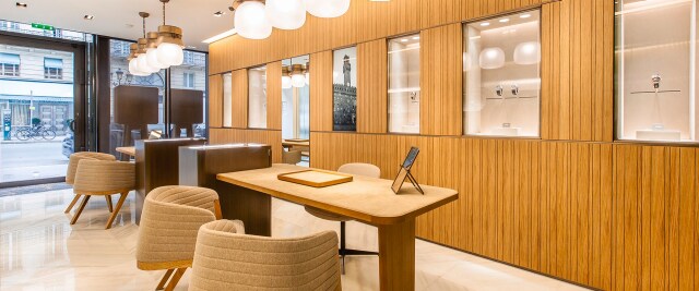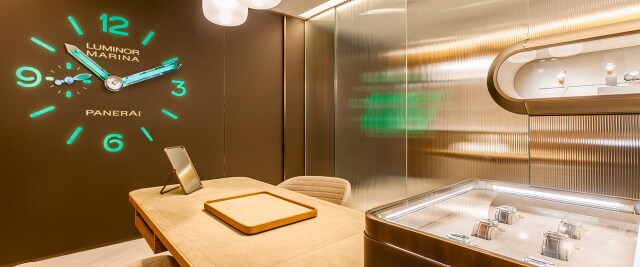 With a surface area of 41 square metres, the boutique welcomes clients in an elegant and pure setting which honours the codes of the Florentine Maison and the technicality of watchmaking. Patricia Urquiola redesigned the space with refined materials – marble, bronze and wood – which evoke the origins of Officine Panerai:the sea. Unique sources of inspiration come into play, such as rippled glass which evokes the sea's waves, oblong windows, a submarine-inspired chandelier and a Panerai watch featured on the wall. The Officine Panerai boutiques now give clients and enthusiasts the opportunity to discover all the collections and special editions in a welcoming space with a pleasant atmosphere complete with wholly Italian style. These settings are the perfect embodiment of the Maison’s philosophy, bringing together tradition with modernity, the past with the future, and design with expertise.